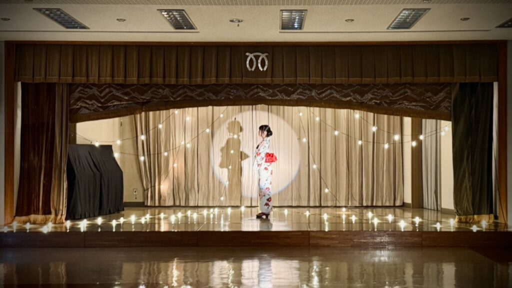 ステージにはカーテンを背景にやわらかいライトをたくさん灯し、