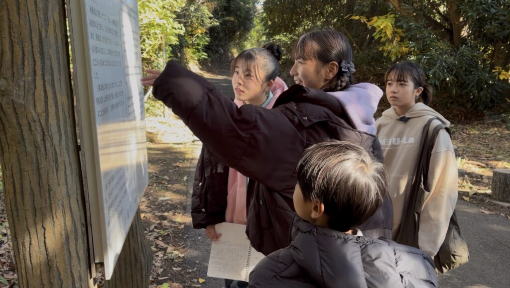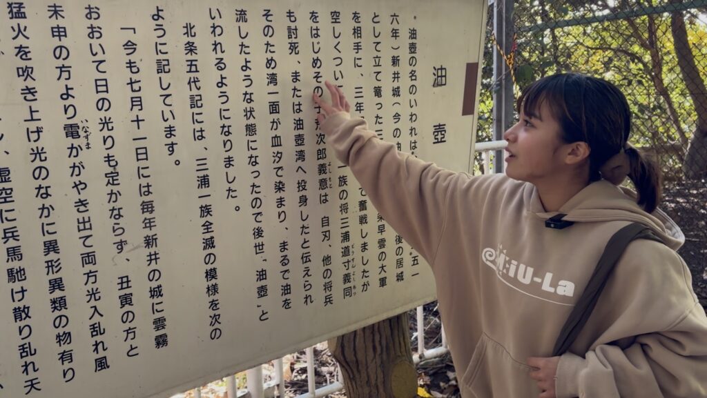 さらに、新井城城跡でも調査!ここでは“三浦一族の最期”が記された看板に出会って、その歴史の終焉にみんなで思いを馳せました。